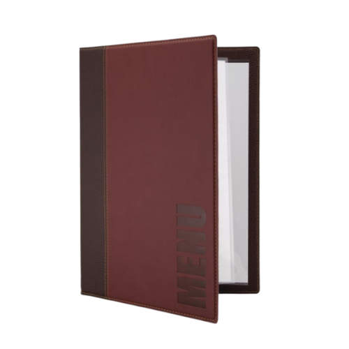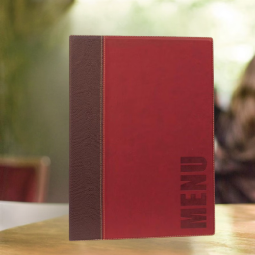 Capa de Menu estilo couro Bordeaux , design elegante e funcional, com bordas cuidadosamente costuradas e a palavra “Menu” em relevo discreto, que transmite requinte e profissionalismo. Ideal para estabelecimentos que pretendem destacar-se, adapta-se facilmente a qualquer decoração, clássica ou moderna. Inclui uma inserção dupla que permite apresentar até 4 páginas A4, oferecendo espaço adequado para destacar pratos, bebidas ou serviços. O sistema de cordão elástico torna a estrutura expansível até 40 páginas A4, facilitando a atualização de menus e ofertas sazonais.