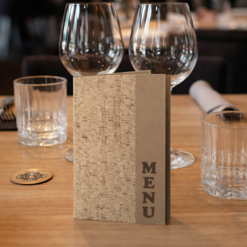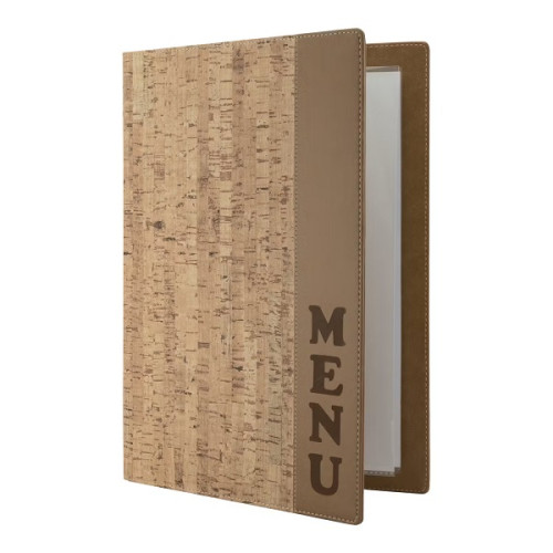 Capa de Ementa em estilo cortiça e couro sofisticado, elegante e funcional, apresenta bordas cuidadosamente costuradas e a palavra “Menu” em relevo discreto, que confere um toque de requinte e profissionalismo. Ideal para estabelecimentos que pretendem destacar-se, adapta-se harmoniosamente a qualquer decoração, seja clássica ou contemporânea. Com uma inserção dupla, permite a apresentação de até 4 folhas A4, oferecendo amplo espaço para apresentar os melhores pratos, bebidas ou serviços. Graças ao sistema de cordão elástico, a estrutura é expansível até 40 folhas A4, o que torna a atualização das ementas e das ofertas sazonais simples e prática.