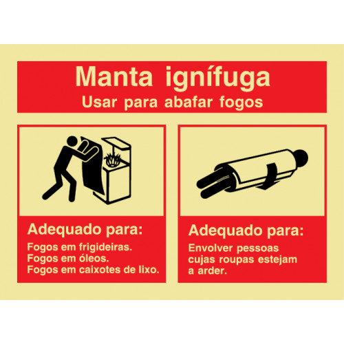 Sinal de manta ignífuga (abafa-fogos), material: PVC Fotoluminescente: Tamanho: 150x100, 200x150, 300x200. Tipo de fixação: Paralelo à parede, Perpendicular à parede, Suspenso no teto. Venda à unidade.