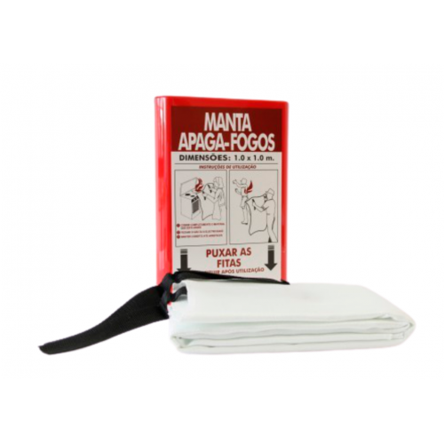 Manta ignífuga produzida em borracha de silicone e fibra de vidro, embalada numa caixa vermelha. Facilmente removível por duas fitas penduradas numa extremidade da manta.