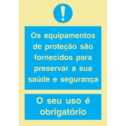Sinal de obrigação, equipamentos de proteção são fornecidos para preservar a sua saúde e segurança, cor azul.