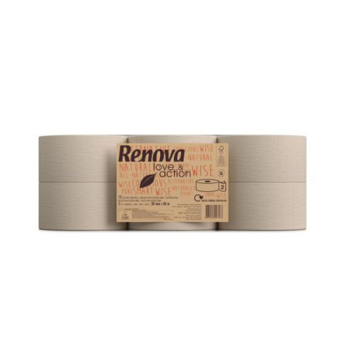 Rolos de papel higiénico Jumbo de folha dupla, fabricados com papel cru natural, maioritariamente proveniente da reciclagem de papéis já usados e pasta provenientes da florestas certificadas ou de origem controlada. Certificado com o Rótulo Ecológico da União Europeia e FSC.