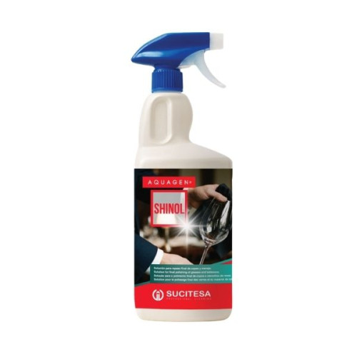 Abrilhantador manual Aquagen Shinol, solução pronta a usar, especialmente desenvolvida para o acabamento final de copos e louça no setor da hotelaria. Modo de utilização: Pulverizar o produto diretamente sobre a superfície a limpar e esfregar com um pano ou camurça que não largue pelos.